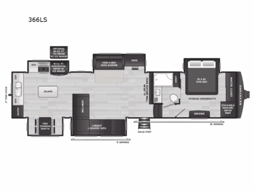 This rear kitchen fifth wheel makes extended stays or weekend trips to the lake enjoyable! The chef of your group will find plenty of counter space with the included kitchen island, plus there is a pantry and 18 cu. ft. residential refrigerator for food storage. A free-standing dinette provides a place to dine together, and the largest L-shaped sofa with recliners will be the perfect spot to relax with a movie. If you have guests, they could sleep here or on the hide-a-bed sofa sleeper. The dual entry bath includes a shower with a seat for added comfort, and the front master bedroom will feel just like home with its king bed slide out and master closet. There is also a dresser and stackable washer and dryer prep if you want to add those appliances!