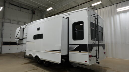 Spend more time having fun and less time worrying about your RV with the Keystone Cougar fifth wheel! These units have all that you will need for excellent vacations. The interior comes with 5/8" one-piece DynaSpan® flooring, tall slide outs for added comfort and head room, night roller shades throughout, and residential, shaker style hardwood cabinet doors and drawers. You will also enjoy decorative crown molding, a 5,500 BTU electric fireplace with thermostat control and remote, and a Max Air exhaust fan with rain sensor. The exterior is also fully outfitted with a convenience center, friction-hinge entry door, electric four-point auto leveling system, and slam-latch baggage door and much more!