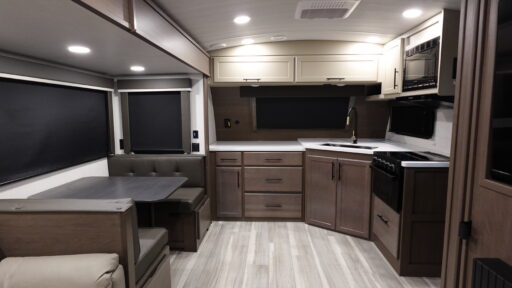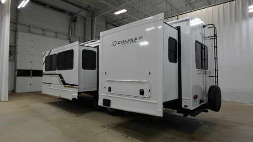 Retreat to the rear bedroom, where a cozy queen bed awaits, with the option to upgrade to a king for added luxury. Ample storage solutions, including wardrobes, dressers, and exterior compartments, ensure you have all the space you need for your travel essentials. Enjoy outdoor living under the expansive 20-foot powered retractable awning, perfect for sun-drenched afternoons or starlit evenings. With a robust cargo capacity and a dry weight of 7,040 lbs, the Cougar Half-Ton 25FKD is ready to accompany you on countless journeys. For more details, visit your nearest General RV dealership.