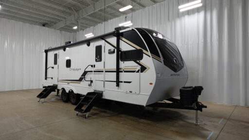 Retreat to the rear bedroom, where a cozy queen bed awaits, with the option to upgrade to a king for added luxury. Ample storage solutions, including wardrobes, dressers, and exterior compartments, ensure you have all the space you need for your travel essentials. Enjoy outdoor living under the expansive 20-foot powered retractable awning, perfect for sun-drenched afternoons or starlit evenings. With a robust cargo capacity and a dry weight of 7,040 lbs, the Cougar Half-Ton 25FKD is ready to accompany you on countless journeys. For more details, visit your nearest General RV dealership.