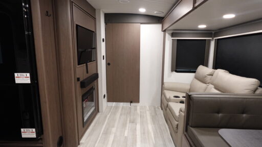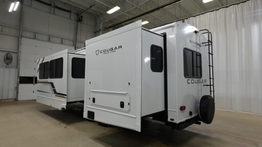 Retreat to the rear bedroom, where a cozy queen bed awaits, with the option to upgrade to a king for added luxury. Ample storage solutions, including wardrobes, dressers, and exterior compartments, ensure you have all the space you need for your travel essentials. Enjoy outdoor living under the expansive 20-foot powered retractable awning, perfect for sun-drenched afternoons or starlit evenings. With a robust cargo capacity and a dry weight of 7,040 lbs, the Cougar Half-Ton 25FKD is ready to accompany you on countless journeys. For more details, visit your nearest General RV dealership.