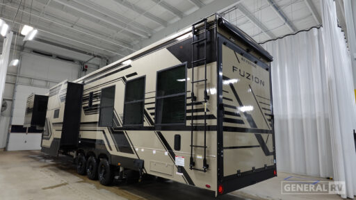 Get your adrenaline pumping with any one of these Keystone RV Fuzion fifth wheel toy haulers! The frame welded, Adjust-A-Trac tie-downs have 38 points to fully secure your toys as you travel, and the extended garage lengths have outside storage so you can haul bigger toys. A fully enclosed fuel pump station is integrated with the iN-Command Generation 3 control system with Global Connect. And the exclusive Omni-Chill technology offers high-efficiency air conditioning and maximum cooling. The interior provides fiberglass backed linoleum flooring, extra-tall slide height, solid wood cabinet and drawer frames, and extra tall ceilings with crown molding to mention a few luxuries. Outside, you'll find three Girard cassette awnings, 4k framed tinted safety glass windows, a Titan hydraulic leveling system, and many more conveniences!