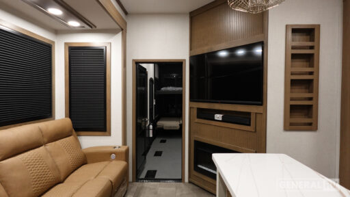 You will have plenty of room to store your off-road toys with a 15' garage area that comes with an Adjust-A-Track system! Once you unload your toys with the 8' MORryde zero gravity ramp door, you can set up the dual opposing sofas with a top queen bed above, the LED TV, and the loft with a bunk mat, plus there is a half bathroom and one of the dual entrance doors to the unit. The chef will have everything they need to prepare their best home cooked meals and others can sit at the center table with swing-out stools to socialize with them while they prepare it. Gather together on the residential four-person sofa slide for movie night with the entertainment center which has a fireplace for an even cozier evening. The dual entry bathroom makes it easy for everyone to freshen up in, especially those staying in the front private bedroom which has a front master closet with washer and dryer prep for clean clothes throughout your trip and Fuzion king bed slide!