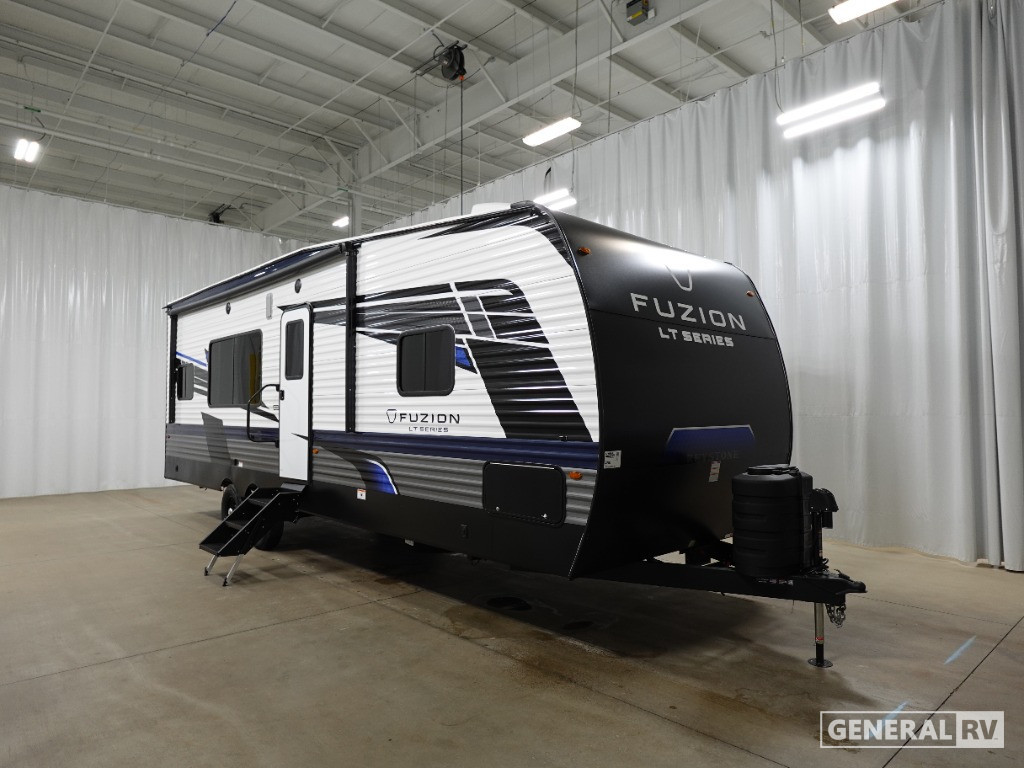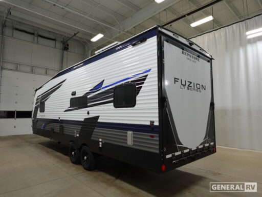 Embrace the great outdoors with a Fuzion Impact Edition toy hauler by Keystone! There is an aluminum exterior and a 8' 4" wide-body construction for your toys and gear! The one-piece polypropylene heated underbelly includes enclosed tanks and valves which will help extend your camping season, and the leaf spring suspension system will provide smooth towing. Head inside to enjoy night shades, hardwood cabinetry, and fiberglass backed linoleum floor with no carpet-free for easy cleaning. Each model also includes a Girard on-demand water heater, two 30 lb. LP tanks, recessed LED puck lighting throughout, and the list of comforts goes on!