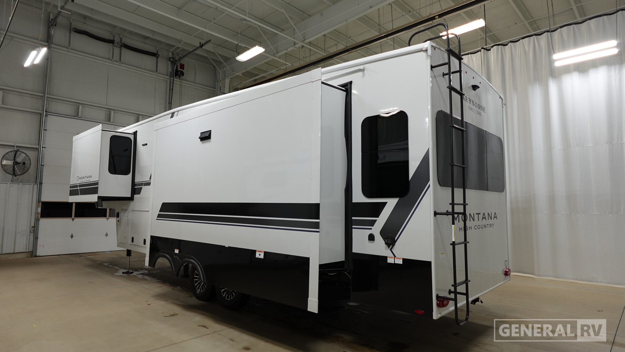 With any Montana High Country fifth wheel by Keystone, you'll find comfort and convenience at every turn! Each unit is built with a fully walkable roof with an Alpha seamless TPO membrane system, 2" thick composite backed high-gloss fiberglass sidewalls, plus an insulated underbelly with forced hot air and electric tank heaters for added protection against the elements. The Blade Pure airflow system provides efficient cooling, and the Tru-Fit slide construction is a durable slide design that minimizes functional motor structural stress and resists leaking. Inside, you'll find roller shades throughout, premium solid surface kitchen countertops, bedside USB and 110V outlets, plus a porcelain foot flush toilet in the bath to name a few comforts.