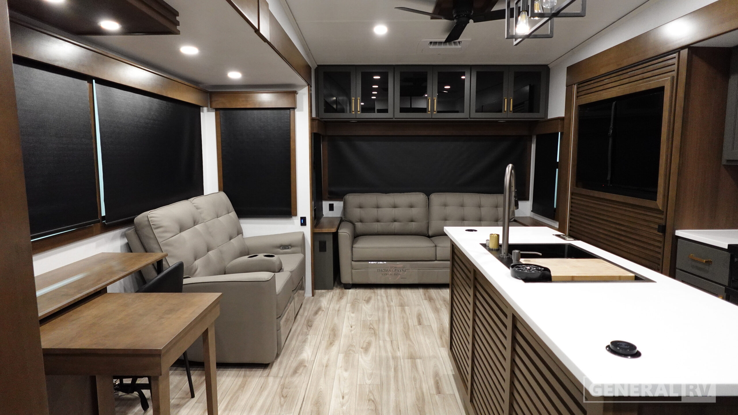 You'll love camping in this fifth wheel with a rear living room and triple slides for ample interior space! The sofa, theater seating, and adjustable sliding 'Deskette" with chairs will provide comfortable seating, dining, and working space, and the entertainment center with a fireplace will make it feel more like home. A large kitchen island gives you more counter space when making meals in the full kitchen, and the spacious full bath is a comfort you won't want to camp without. Up front, you'll find a private bedroom with a king bed slide, storage space and TV prep if you want the option to watch movies in bed.