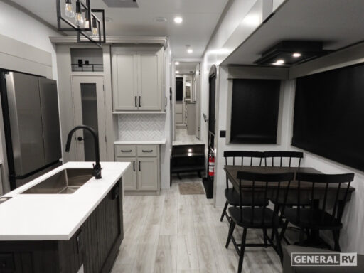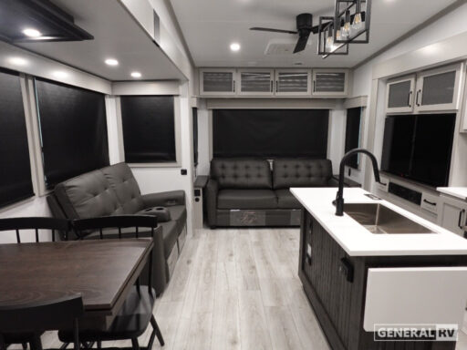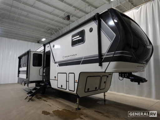 This Montana High Country model is not just about luxury; it's also about functionality. With a generous fresh water capacity of 91 gallons and ample gray and black water storage, your off-grid adventures are well-supported. The automatic heater keeps you cozy in cooler weather, while the powered retractable awning invites you to enjoy the great outdoors in style. To experience this exceptional RV firsthand, visit your nearest General RV dealership and start your journey into the world of unparalleled comfort and adventure.