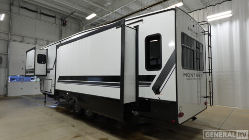 Outside, the 29-foot powered retractable awning offers a shaded retreat, while the Morryde solid step with strut assist ensures easy access. With a generous cargo capacity and a robust towing capacity, the Montana High Country 331RL is ready for any adventure. Visit your nearest General RV dealership to explore this remarkable RV and start your journey today!