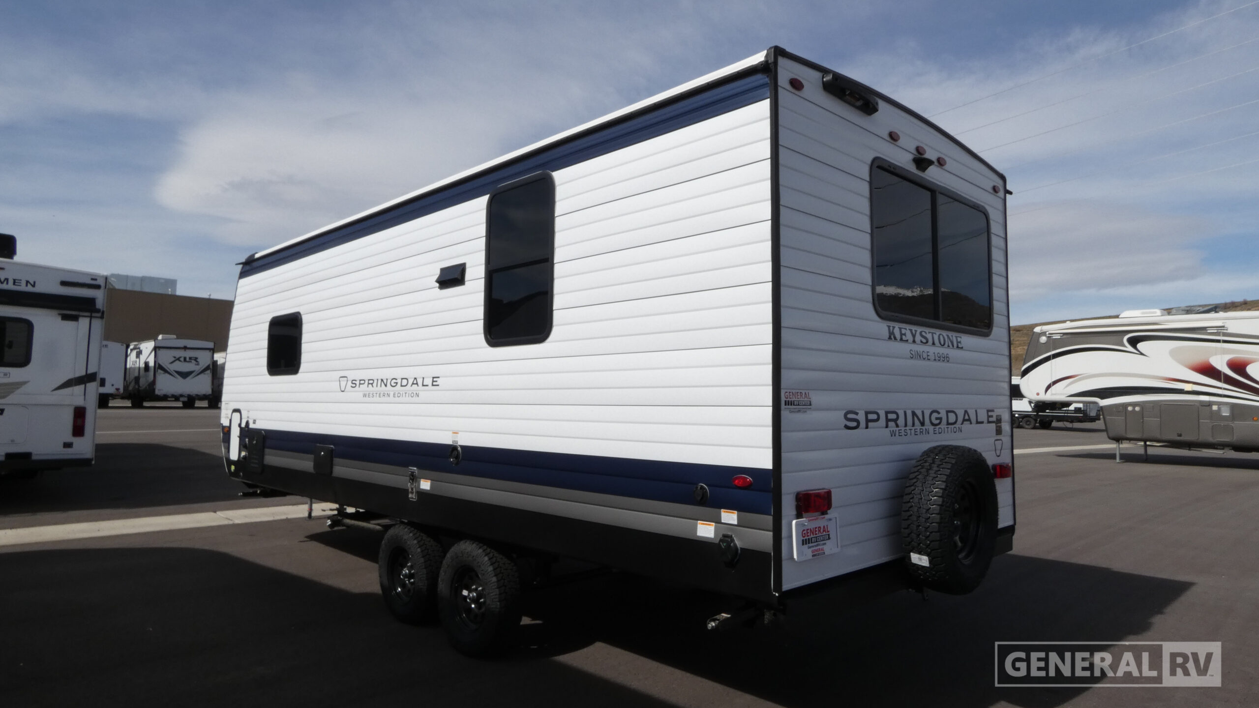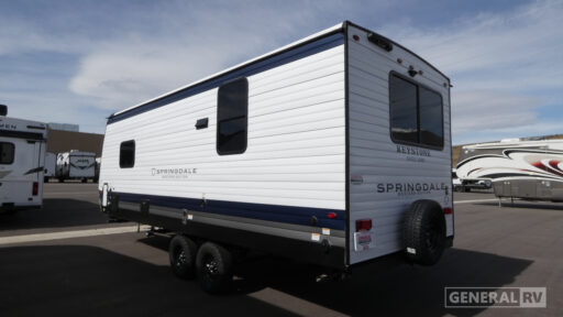 Springdale travel trailers by Keystone are built with durability and comfort in mind. Construction features include a sturdy I-beam frame, AlphaPly TPO roof membrane, and laminated sidewalls for long-lasting performance. Exterior conveniences such as a power awning with LED lighting, outside shower with hot and cold water, and heavy-duty stabilizer jacks enhance campsite setup. Inside, owners will appreciate quality finishes, efficient storage solutions, and Keystone-exclusive features.