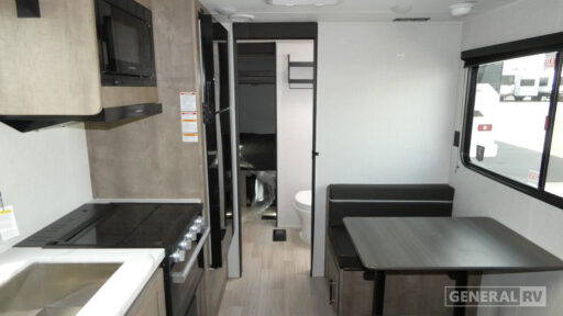 This well-designed travel trailer offers a comfortable layout with easy flow from front to rear. The rear living area features a booth dinette with convenient storage below, positioned near oversized windows that bring in plenty of natural light. The kitchen is equipped for everyday camping needs, including ample cabinet space and modern appliances, while LED lighting keeps the interior bright and inviting. A centrally located bathroom remains accessible even with the slide closed, adding convenience on travel days. Thoughtful touches like blackout night shades and multiple charging outlets help make extended stays more enjoyable.