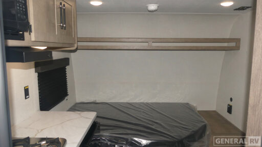Your small crew will love camping in this lightweight travel trailer. There is a full-size bed up front with an overhead shelf to keep belongings out of the way. The two-burner cooktop and microwave oven will let you make breakfast in the morning, and the bar table with two stools provides a place to dine together. And a private bath with a shower and toilet lets you easily clean up after a day outdoors!