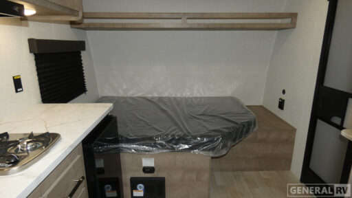 Your small crew will love camping in this lightweight travel trailer. There is a full-size bed up front with an overhead shelf to keep belongings out of the way. The two-burner cooktop and microwave oven will let you make breakfast in the morning, and the bar table with two stools provides a place to dine together. And a private bath with a shower and toilet lets you easily clean up after a day outdoors!