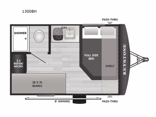 Full-Size Bed Exterior Pass-Thru Storage 3.3 Cu. Ft. 12V Refrigerator Bunk Beds