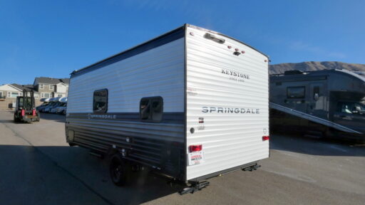 With any Springdale Mini travel trailer by Keystone, you will enjoy lightweight towing thanks to their single axle! The XL tinted safety glass windows are ultra durable, and the power awning will provide protection from the sun as you relax in your camp chairs outside. Each model includes blackout night shades, LED lighting, plus many more interior comforts. There is also a 20K BTU furnace to keep you comfortable, plus a tankless water heater for endless hot showers!