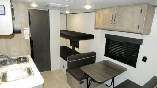This travel trailer with rear corner bunk beds is sure to be a hit at the campground! While your guests or little ones take the bunks, you can enjoy the front Olympic RV queen bed to yourselves. There is even storage under the bed, an overhead shelf, and a wardrobe for your things. The chef of your group can whip up meals on the two-burner cooktop or in the microwave oven, and there is a 3.3 cu. ft. 12V refrigerator to keep food fresh. A booth dinette provides a place to dine together, or you can take your plate outdoors to sit under the 8' power awning with LED lights!