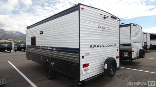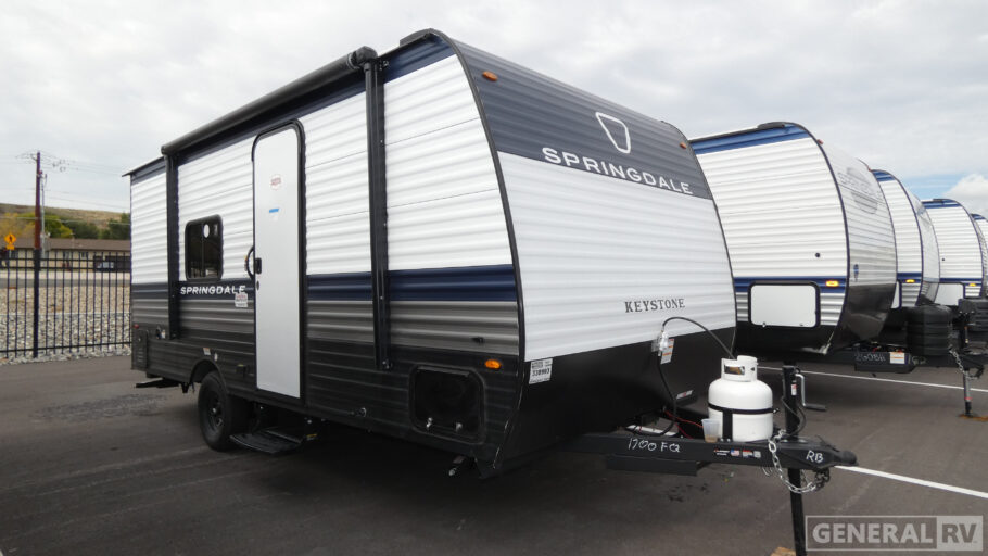 With any Springdale Mini travel trailer by Keystone, you will enjoy lightweight towing thanks to their single-axle! The AlphaPly TPO roof membrane is ultra durable, and the power awning will provide protection from the sun as you relax in your camp chairs outside. Each model includes blackout night shades, LED lighting, plus many more interior comforts. There is also a roof A/C and 20K BTU furnace to keep you comfortable, plus a tankless water heater for endless hot showers!