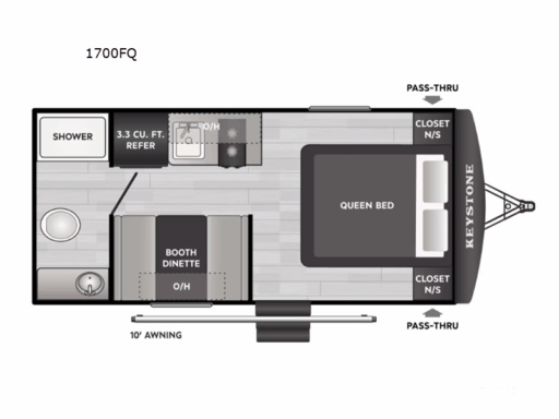 This cozy trailer for two or four will have you out enjoying nature easily. There is a queen bed for you, and the booth dinette can easily transform into a bed for one or two more campers if needed at night. The rear private bath features a shower and vanity with sink, plus toilet so no late night trips to the campground bathroom. There is ample storage in overhead cabinets on both sides of the trailer, as well as dual closets and nightstands on either side of the bed. A 10' awning offers even more living space outside. Grab a couple of camp chairs and enjoy hanging out with your campground neighbors or enjoying a campfire.