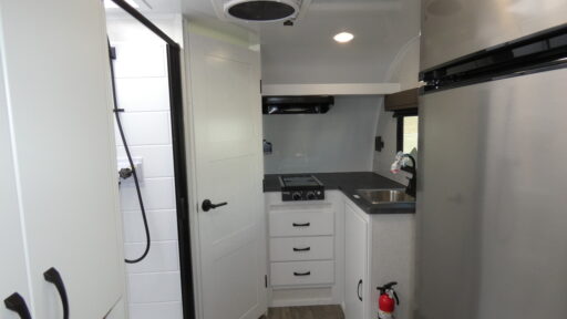 You'll love camping in this spacious trailer that can sleep up to three people. There is a two-burner stove with a cover so you can cook meals and enjoy extra counter space when you need it. The large refrigerator/freezer will let you keep your food fresh, and the stainless-steel sink will make clean up easier than ever. The dinette/bed will give you a place to dine together, and you're sure to appreciate the flex-bed system that gives you the option for a 78" x 83" bed, two twin-size beds, or a full-size bed! This trailer also includes a dry bathroom, a feature usually unheard of in teardrop trailers!