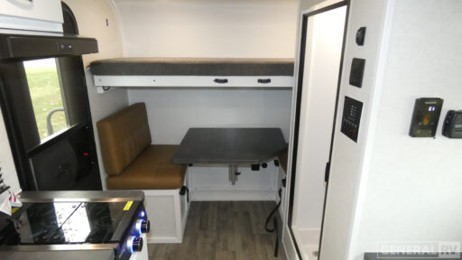 If you're looking for a lightweight trailer with a little more comfort, take a look at this one! There is a 60" x 77" bed to sleep on each night, along with a booth dinette that converts to a 78" x 30" bed and an upper 78" x 27" bunk, allowing you to sleep up to five! The kitchen includes a two burner stove, countertop and 12V refrigerator to keep food fresh. This unit also features four side windows, black roller shades, and a desk with desk drawers if you need to get some work done.