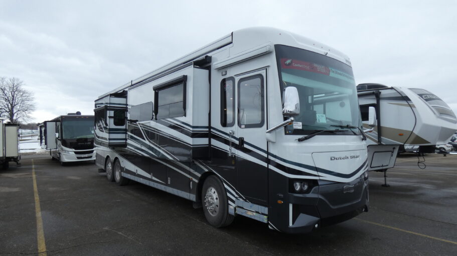 Step into the heart of the Dutch Star, where a center kitchen awaits with top-of-the-line amenities, including a two-burner cooktop and a full-size electric refrigerator. The convection cooking capability and hide-a-leaf dinette make meal preparation and dining a delight. The rear and center bath areas are thoughtfully designed with high-quality fixtures and a washer/dryer for added convenience. With a fresh water capacity of 105 gallons and a powered retractable awning, this RV is ready for extended journeys. Whether you're cruising down the highway or parked at a scenic spot, the Dutch Star 4081 offers unmatched luxury and functionality. For more details, visit your nearest General RV dealership.