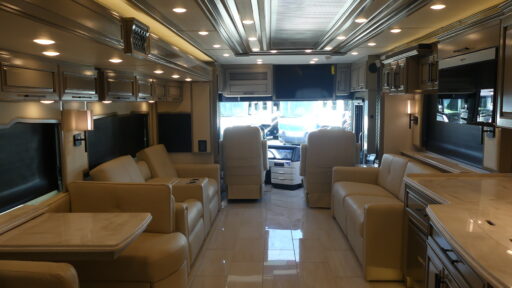 Have an amazing ride in the brand-new luxurious motorhome. This unit is perfect for five. Sleep comfortably in the bedroom on the 72" x 80" king bed ideal for you and your partner, store your things in the dresser, and entertain yourself watching the TV. Guests or the rest of the family can easily fit on the 87" hide-a-bed sofa and the 74" jack knife sofa. Moreover, cook delicious meals in a chef's dream kitchen, which includes a 17.9 cu. Whirlpool refrigerator, 30" stainless steel convection microwave with air fryer feature, hide-a-leaf dinette, overhead cabinets, pantry, and shelf storage. Finally have a relaxing time in the luxury and spacious rear bathroom. The dual sink will allow you and a plus one to do your skincare routine together, plus, it includes wardrobes with drawers and a washer and dryer space. Finally, after a long ride, take a refreshing bath in the 40” x 32” shower.