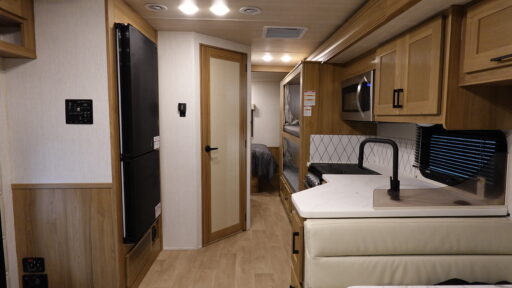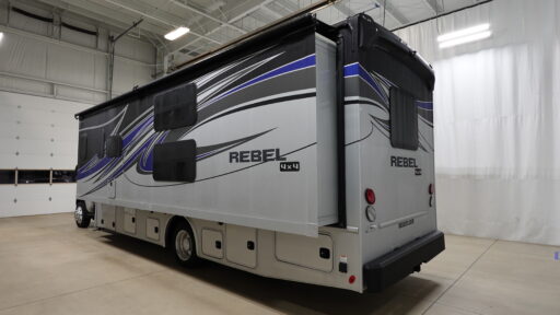 Inside, the Rebel 35R is designed for both relaxation and functionality. The front living area, featuring a comfortable sofa and dinette, invites you to unwind after a day of exploration. The center kitchen is equipped with a full-size electric refrigerator, convection cooking, and a three-burner cooktop, making meal preparation a breeze. The rear bedroom offers a peaceful retreat with a queen bed and ample storage, while the center bath ensures convenience with its easy-access design. With a powered retractable awning and a generous 85-gallon fresh water capacity, this RV is ready for both short getaways and extended adventures. For more details, visit your nearest General RV dealership.