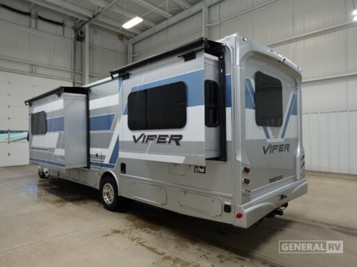 The center kitchen is equipped with a full-size electric refrigerator and a three-burner cooktop, making meal preparation a breeze. The rear bedroom features a plush queen bed, offering a restful retreat at the end of the day. With ample overhead cabinets and a wardrobe, storage won't be an issue. The powered retractable awning extends your living space outdoors, providing shade and comfort for alfresco dining or simply enjoying the scenery. Built on a robust Ford E450 chassis with a 325 horsepower engine, the Viper 29V ensures a powerful and smooth ride. Visit your nearest General RV dealership to see how the Viper 29V can elevate your travel adventures.