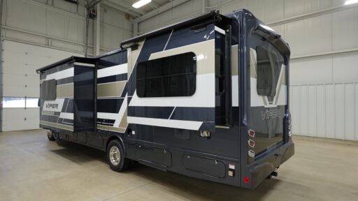 The center kitchen is equipped with a full-size electric refrigerator and a three-burner cooktop, making meal preparation a breeze. The rear bedroom features a plush queen bed, offering a restful retreat at the end of the day. With ample overhead cabinets and a wardrobe, storage won't be an issue. The powered retractable awning extends your living space outdoors, providing shade and comfort for alfresco dining or simply enjoying the scenery. Built on a robust Ford E450 chassis with a 325 horsepower engine, the Viper 29V ensures a powerful and smooth ride. Visit your nearest General RV dealership to see how the Viper 29V can elevate your travel adventures.