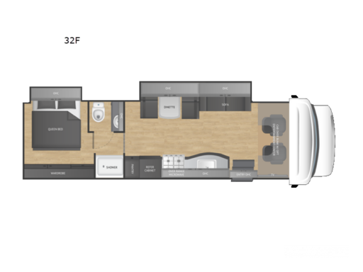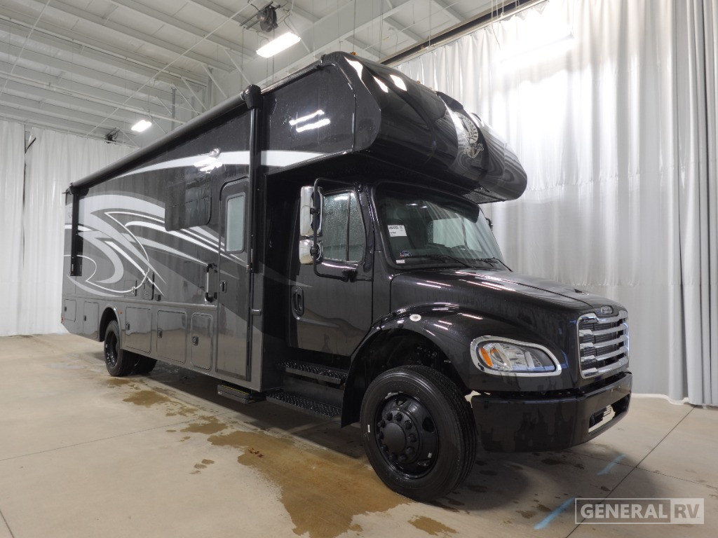 The Wraith 32F boasts a front living area that invites relaxation, complete with a dinette and sofa, perfect for gathering with family and friends. The center bath offers convenience with its shower curtain setup, while the rear bedroom provides a tranquil retreat with a spacious queen bed and ample wardrobe storage. With a robust Cummins engine, Freightliner S2RV chassis, and a towing capacity of 10,000 pounds, this RV is as powerful as it is luxurious. Plus, the powered retractable awning extends your living space to the great outdoors, making every destination feel like home. For more details, visit your nearest General RV dealership and start your adventure today!