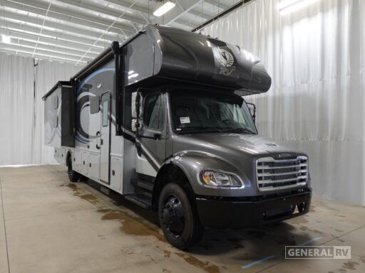 The thoughtfully designed floorplan includes a center bath with a practical shower curtain for easy access and privacy. In the rear, the master bedroom promises restful nights with its inviting king bed. The powered retractable awning provides the perfect outdoor retreat, whether you're parked by a serene lakeside or a bustling campsite. Built on a robust Freightliner S2RV chassis and powered by a Cummins diesel engine, the Wraith 35F ensures a smooth and powerful ride. With ample storage and a 10,000-pound towing capacity, this RV is ready to take on any journey. For more details, visit your nearest General RV dealership.