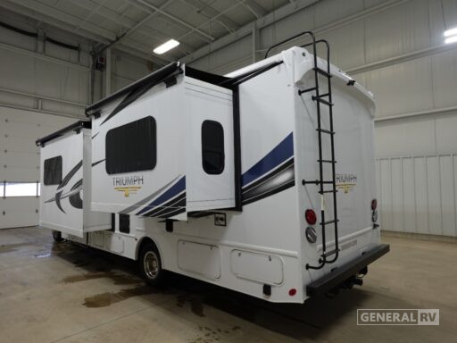 The thoughtfully designed layout includes a front living area with a cozy dinette and a 64" sofa, perfect for relaxing after a day of exploration. The rear bedroom offers a tranquil retreat with ample storage, while the rear bath ensures privacy and convenience. Enjoy the outdoors with the powered retractable awning, and rest easy knowing you're backed by the reliable Ford E450 chassis with 325 horsepower. Whether you're embarking on a cross-country journey or a weekend getaway, the Triumph 29T is your ticket to unforgettable memories. For more details or to see it in person, visit your nearest General RV dealership.