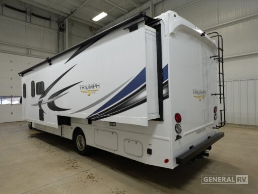 The center kitchen is equipped with a full-size electric refrigerator, three-burner cooktop, and convection cooking capabilities, making meal preparation a breeze. The powered retractable awning extends your living space to the outdoors, creating an ideal setting for alfresco dining or simply enjoying the scenery. The rear bedroom offers a serene retreat, complete with ample storage and a dedicated space for entertainment. Built on a robust Ford E450 chassis with a 325 horsepower engine, the Triumph 30T is ready to take you on your next adventure with confidence and style.