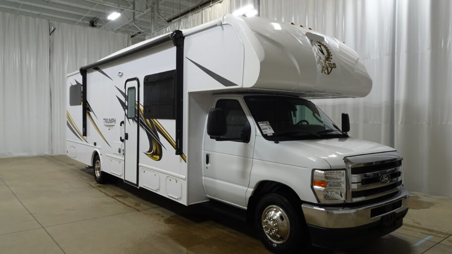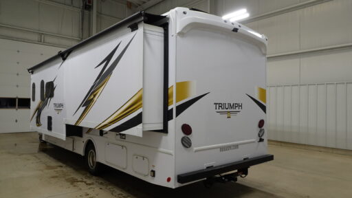 The center kitchen is equipped with a full-size electric refrigerator, three-burner cooktop, and convection cooking capabilities, making meal preparation a breeze. The powered retractable awning extends your living space to the outdoors, creating an ideal setting for alfresco dining or simply enjoying the scenery. The rear bedroom offers a serene retreat, complete with ample storage and a dedicated space for entertainment. Built on a robust Ford E450 chassis with a 325 horsepower engine, the Triumph 30T is ready to take you on your next adventure with confidence and style.