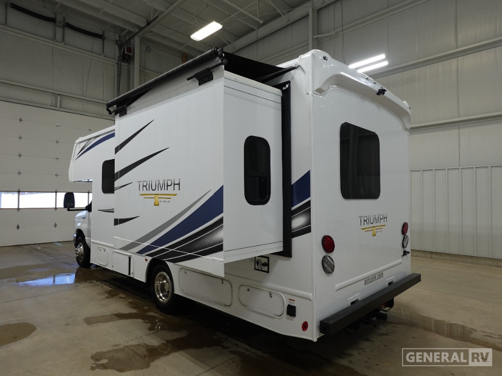 Inside, the Triumph Sport 22TS is designed for comfort and convenience. The front living area welcomes you with a cozy convertible dinette, perfect for meals or game nights. The center kitchen, equipped with a full-size electric refrigerator and a three-burner cooktop, allows you to whip up your favorite meals while on the go. At the rear, unwind in the private bath with a shower curtain for easy access. Sleeping arrangements are a breeze with a queen bed, a full-size bed, and a convertible option, accommodating up to six people comfortably. With ample storage, including a wardrobe and pantry, and a 60-amp electrical service, this RV ensures every journey is as enjoyable as the destination. For more details, visit your nearest General RV dealership.
