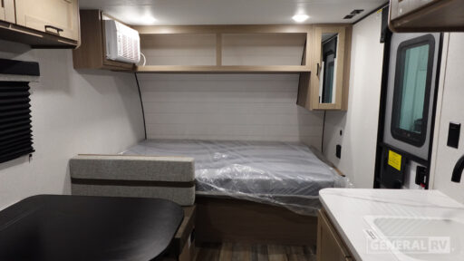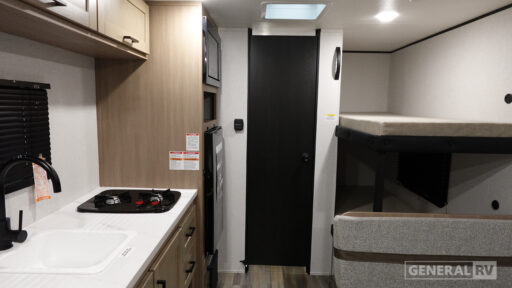 This easy to tow travel trailer features compact sleeping spaces thanks to the bunk beds in the rear corner, and the private bath is right next to the bunks for easy nighttime use! You'll have the front queen bed to yourselves, while another guest or two little ones convert the booth dinette to sleeping space. A two-burner cooktop and microwave oven will let you make meals each day, and there is a 12V refrigerator to keep your cold items fresh. Outside, you'll enjoy the 10' power awning for added shade, and there is exterior storage to keep fishing poles, hiking gear and more!