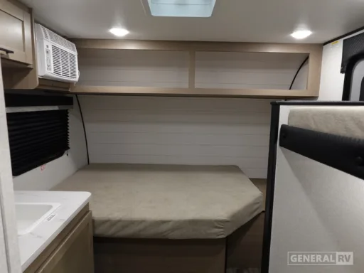 This lightweight travel trailer includes everything you need for comfortable camping trips at the lake. You can make your meals on the two-burner cooktop or in the microwave oven, and a 12V refrigerator will keep leftovers fresh. A front bed provides a great night's rest, and there are 30" x 73" bunk beds for your guests or little ones. And a private bath with a shower and toilet will let you easily freshen up without having to use the camp's facilities!