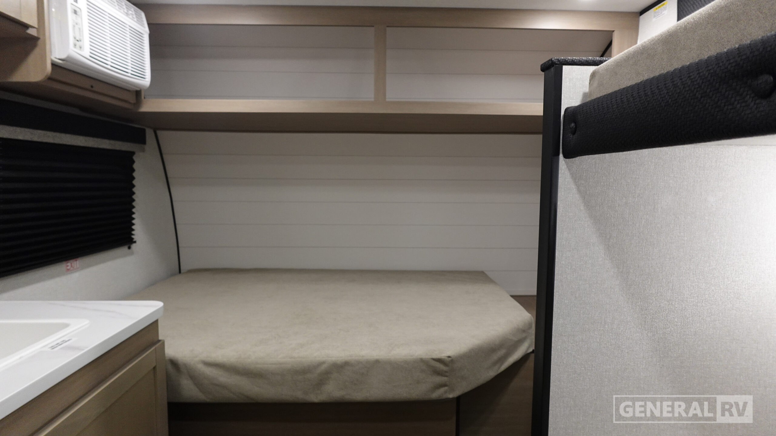 This lightweight travel trailer includes everything you need for comfortable camping trips at the lake. You can make your meals on the two-burner cooktop or in the microwave oven, and a 12V refrigerator will keep leftovers fresh. A front bed provides a great night's rest, and there are 30" x 73" bunk beds for your guests or little ones. And a private bath with a shower and toilet will let you easily freshen up without having to use the camp's facilities!