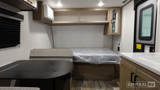 This easy to tow travel trailer features compact sleeping spaces thanks to the bunk beds in the rear corner, and the private bath is right next to the bunks for easy nighttime use! You'll have the front queen bed to yourselves, while another guest or two little ones convert the booth dinette to sleeping space. A two-burner cooktop and microwave oven will let you make meals each day, and there is a 12V refrigerator to keep your cold items fresh. Outside, you'll enjoy the 10' power awning for added shade, and there is exterior storage to keep fishing poles, hiking gear and more!