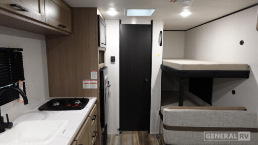 This easy to tow travel trailer features compact sleeping spaces thanks to the bunk beds in the rear corner, and the private bath is right next to the bunks for easy nighttime use! You'll have the front queen bed to yourselves, while another guest or two little ones convert the booth dinette to sleeping space. A two-burner cooktop and microwave oven will let you make meals each day, and there is a 12V refrigerator to keep your cold items fresh. Outside, you'll enjoy the 10' power awning for added shade, and there is exterior storage to keep fishing poles, hiking gear and more!