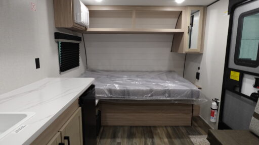 This easy to tow travel trailer features compact sleeping spaces thanks to the double-size bunk beds in the rear corner, and the private bath is right next to the bunks for easy nighttime use! You'll have the front queen bed to yourselves, along with a wardrobe, nightstand, and overhead shelf for your things. A two-burner cooktop and microwave oven will let you make meals each day, and there is a 12V refrigerator to keep your cold items fresh. Outside, you'll enjoy the 10' power awning for added shade, and there are two exterior storage compartments to keep fishing poles, hiking gear and more!