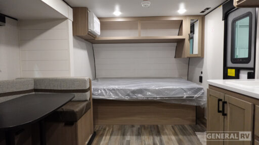 This easy to tow travel trailer features compact sleeping spaces thanks to the double-size bunk beds in the rear corner, and the private bath is right next to the bunks for easy nighttime use! You'll have the front queen bed to yourselves, along with a wardrobe, nightstand, and overhead shelf for your things. And any other guests can convert the U-shaped dinette to sleeping space, allowing you to sleep eight total in this unit! A two-burner cooktop and microwave oven will let you make meals each day, and there is a 12V refrigerator to keep your cold items fresh. Outside, you'll enjoy the 10' power awning for added shade, and there are two exterior storage compartments to keep fishing poles, hiking gear and more!
