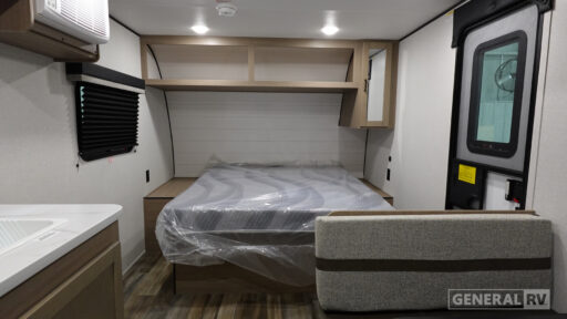 This travel trailer is just what the doctor ordered! Once you've loaded up the exterior storage, you can head out to the campground of your choice. The 10' power awning can be put out when you arrive, then you can relax in your camp chairs or head inside to make lunch on the two-burner cooktop. There is also a microwave oven for quick meals and a 12V refrigerator for food storage. A booth dinette provides a place to dine together, and you can convert it to sleeping space at night for one to two guests. You'll love the front queen bed that includes an overhead shelf and a wardrobe for your things, and this unit includes a full rear bath for added privacy. Here, you'll find a 24" x 32" shower, a toilet, and a linen closet plus shelves/storage for toiletries and towels!