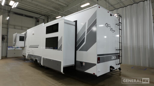 With any Open Range 3X fifth wheel by Open Range RV, you will enjoy residential luxuries and an exceptional build. The TuffShell construction includes vacuum bonded laminated fiberglass and welded aluminum frames for added strength, and the PVC roofing membrane is ultra durable. You can plan to camp year around or go full-time since there is a mandatory Four Season Package that includes a heated and enclosed underbelly, a 40K BTU high-performance furnace, double insulated baggage doors, and more. The residential features continue on with the mandatory Executive Package with the TravelLINK Smart RV system, Keyed-Alike entry and baggage doors, painted fiberglass front cap with LED lighting, and three 15,000 BTU A/C units with quiet residential return air. Inside, you'll enjoy GE kitchen appliances, sleek square windows with integrated blinds, ceramic subway tile backsplash, a glass shower door, and the list of amenities goes on!