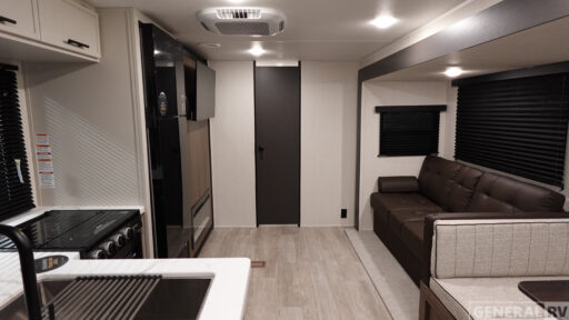 You'll appreciate the added space in this travel trailer thanks to the large slide out! The booth dinette and sofa are found here, and there is a moveable storage ottoman for extra blankets or board games. You'll have your own space up front in the private bedroom, complete with a camp king bed and storage for your things. The chef of your group will find a three burner cooktop and a built-in convection microwave with an air fryer to cook meals, plus there is a 12V refrigerator and hidden pantry for food storage. This unit also includes a power awning outdoors and an outside refrigerator to keep cold drinks close by.