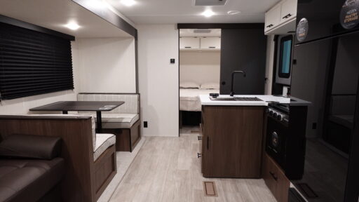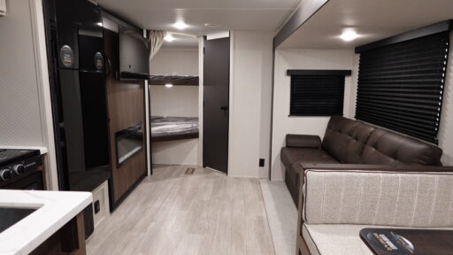 You'll appreciate the added space in this travel trailer thanks to the large slide out! The booth dinette and sofa are found here, and there is a moveable storage ottoman for extra blankets or board games. You'll have your own space up front in the private bedroom, complete with a camp king bed and storage for your things, while your guests take the double-size bunk beds towards the back. The chef of your group will find a three burner cooktop and a built-in convection microwave with an air fryer to cook meals, plus there is a 12V refrigerator and large hidden pantry for food storage. This unit also includes a power awning outdoors and an outside refrigerator to keep cold drinks close by.