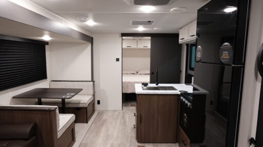 You'll appreciate the added space in this travel trailer thanks to the large slide out! The booth dinette and sofa are found here, and there is a moveable storage ottoman for extra blankets or board games. You'll have your own space up front in the private bedroom, complete with a camp king bed and storage for your things, while your guests take the double-size bunk beds towards the back. The chef of your group will find a three burner cooktop and a built-in convection microwave with an air fryer to cook meals, plus there is a 12V refrigerator and large hidden pantry for food storage. This unit also includes a power awning outdoors and an outside refrigerator to keep cold drinks close by.