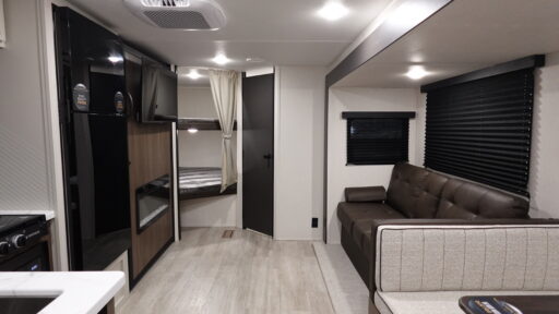 You'll appreciate the added space in this travel trailer thanks to the large slide out! The booth dinette and sofa are found here, and there is a moveable storage ottoman for extra blankets or board games. You'll have your own space up front in the private bedroom, complete with a camp king bed and storage for your things, while your guests take the double-size bunk beds towards the back. The chef of your group will find a three burner cooktop and a built-in convection microwave with an air fryer to cook meals, plus there is a 12V refrigerator and large hidden pantry for food storage. This unit also includes a power awning outdoors and an outside refrigerator to keep cold drinks close by.