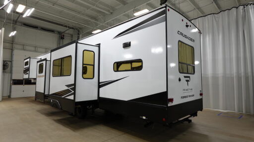 With any Crusader fifth wheel by Prime Time, you will enjoy outstanding quality and premium features! The Dexter E-Z Flex rubberized suspension equalizer will help make towing smoother than ever, and the high gloss gel coated exterior fiberglass is sure to be eye-catching. There are also thick insulated pass-through storage baggage doors outside, along with a 102" wide body, and hassle-free one-touch auto leveling. Inside, you'll find real wood cabinet doors, carpet-less slide rooms, blackout roller shades, and stain resistant, easy clean furniture. The Crusader fifth wheels are built with Eternabond construction, a one-piece PVC roof membrane, radiant foil insulation, plus rack and pinion slide systems.