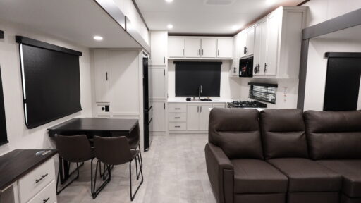 If you enjoy camping with family or friends, this fifth wheel is sure to meet all of your needs! The front bedroom includes a queen bed slide out for more space and comfort, plus a front wardrobe with washer and dryer prep. And the full bath is right next door for easy nighttime use. Your guests can utilize the middle bonus room that includes an E-Z glide sofa slide out, a private loft, and a half bath! The living room is made spacious thanks to the dual opposing slides, and you'll find a sectional sleeper sofa here, as well as desk with a chair and a free-standing table with chairs. And don't overlook the rear kitchen with ample counter space, a four burner range, an accessory sink and a French door 12V refrigerator!