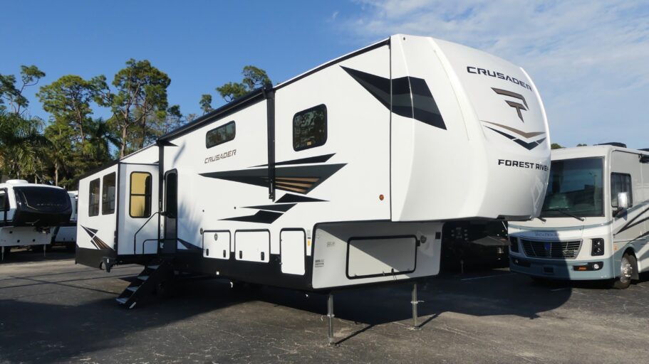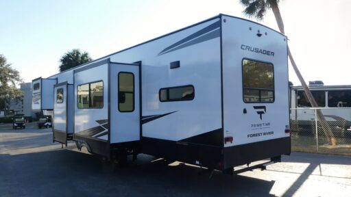 With any Crusader fifth wheel by Prime Time, you will enjoy outstanding quality and premium features! The Dexter E-Z Flex rubberized suspension equalizer will help make towing smoother than ever, and the high gloss gel coated exterior fiberglass is sure to be eye-catching. There are also thick insulated pass-through storage baggage doors outside, along with a 102" wide body, and hassle-free one-touch auto leveling. Inside, you'll find real wood cabinet doors, carpet-less slide rooms, blackout roller shades, and stain resistant, easy clean furniture. The Crusader fifth wheels are built with Eternabond construction, a one-piece PVC roof membrane, radiant foil insulation, plus rack and pinion slide systems.